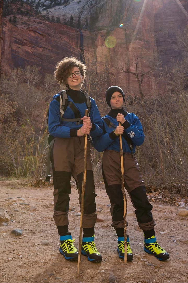 The Kid’s Drysuit Package is recommended from Fall to Spring for children between about 4 and 5 feet in height. The suits generally fit kids ages 8 an up. Since water levels are much deeper on children, a full suit is necessary to stay dry. A tight rubber gasket in the ankle and wrist of the suit keeps all water out, allowing hikers to wear regular hiking clothes and insulating layers underneath. The feet will get wet but will be kept warm by the neoprene socks which insulate and cause much fewer blisters than a regular wet sock. The canyoneering boots provide unmatched grip on wet and dry rock and provide necessary ankle support. The wooden hiking stick is ideal for balance and stability and holds up much better than regular trekking poles in the Narrows.